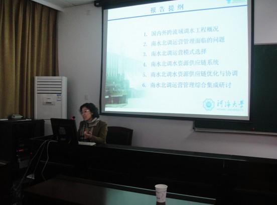 王慧敏教授的学术报告题目为“供应链管理在跨流域调水工程运营管理中的应用”。王教授从国内外跨流域调水工程概况、南水北调工程运营管理面临的问题、南水北调运营模式选择、南水北调水资源供应链系统、南水北调水资源供应链协调与优化以及南水北调运营的综合集成研讨等六个方面,详细阐述了供应链管理在南水北调工程中的具体应用问题。该学术报告进一步拓宽了我院师生从事供应链研究的思路,受到了与会师生的一致认同。学术报告在热烈的掌声中结束。