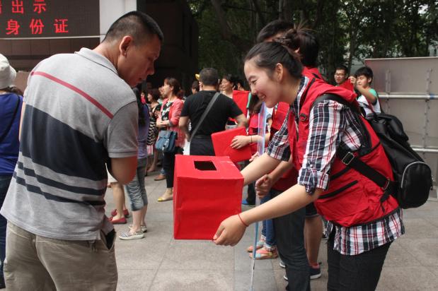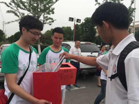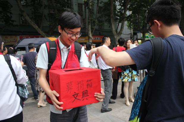 当高考的学子走出考场如释重负的那一瞬,志愿者上前将来意讲明,鼓励学子们将自己的尺规笔杆、草稿纸投入募捐箱。随着越来越多的学子从紧张的考场中走出,募捐箱渐渐被他们的爱心充满。在这个小小的红色募捐箱里,那些长短不一,种类繁杂的文具,是一个又一个学生、一个又一个家庭的梦想,然而在不久后这些梦想将远赴千里,去帮助和实现另外一群孩子的理想。