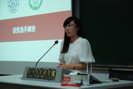 我院14级研究生韩温钰同学作为上届获奖选手发言。她首先介绍了竞赛题型,之后分享了自己的准备经历和收获。韩温钰感慨竞赛的收获丰厚,不光收获了优异的名次和实习机会,还理解工作中遇到的金融衍生品,收获了胜任工作的技能。