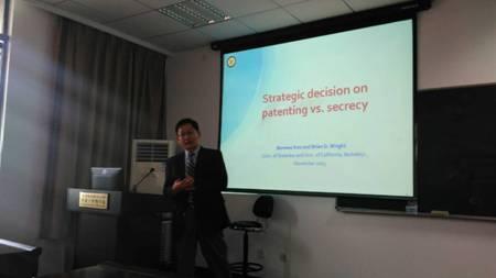 2015年11月5日下午2点,在九游体育 大楼704报告厅,加拿大滑铁卢大学管理科学系的Bonwoo Koo教授来学院,作了“Strategic decision on patenting vs. secrecy”的报告。副院长王英,区域经济与产业经济研究所所长江可申,智能决策与风险分析研究所的陈晔、陈洪转、李杰,区域经济与产业经济研究所的苗建军张伟、马晓平等老师以及两所的全体研究生参加了此次报告。
