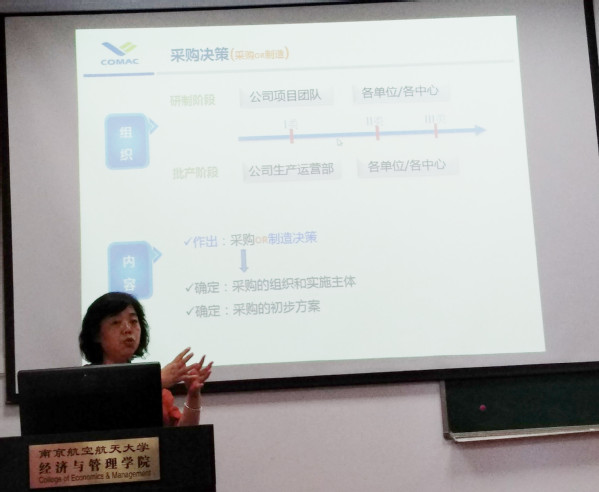 李研究员为我们详细讲述了供应商的分类,采购决策的具体流程,相关流程控制文件,民用飞机主供模式,最后围绕中国商飞公司的具体采购和供应商职能管理做出了形象具体的说明。通过一线的具体情况让同学们进一步深入了解了一些供应链管理知识。