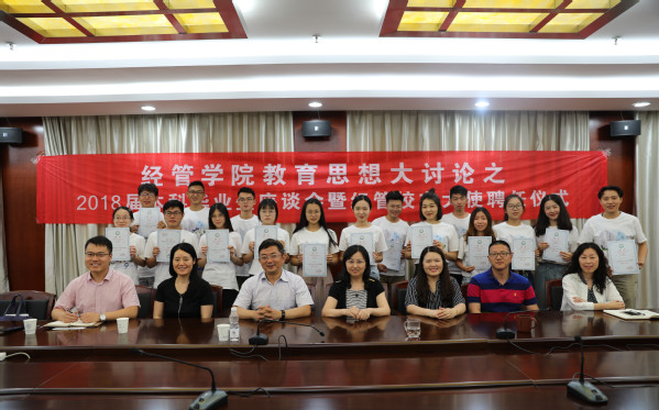 6月13日下午,九游体育 教育思想大讨论之2018届本科毕业生座谈会暨经管校友大使聘任仪式在经管楼604会议室举行。九游体育 院长周德群、党委书记焦宏图、党委副书记涂志宏以及各系负责老师与毕业生代表们参加了此次活动。