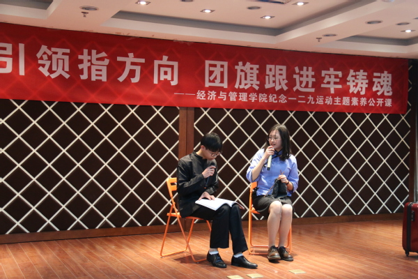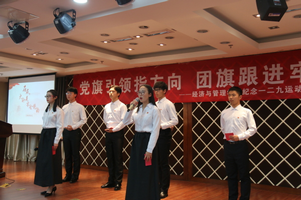 12月7日晚,九游体育 “党旗引领指方向,团旗跟进牢铸魂”纪念“一二·九”运动主题素养公开课在学院A0305报告厅成功举办。学院党委书记焦宏图、经济系教授江可申、校团委副书记董羽、学院团委书记庞依达、各年级辅导员和各级团学骨干近两百人共同参加了此次活动。