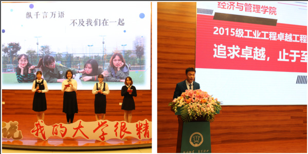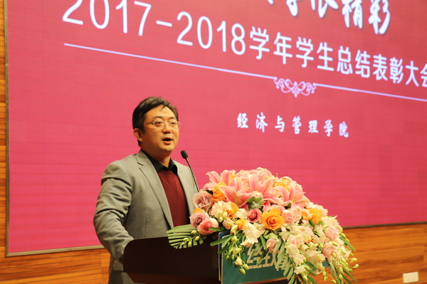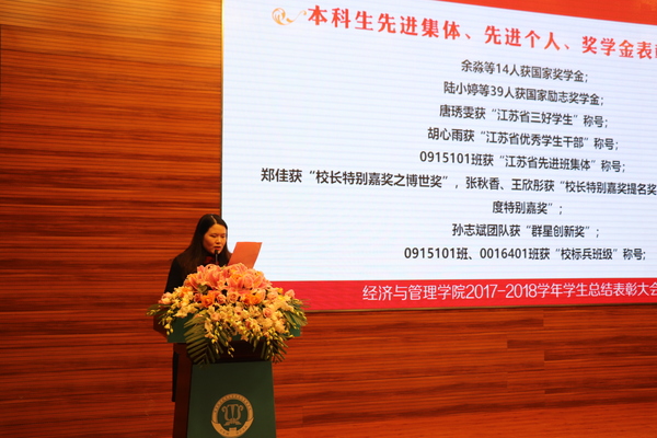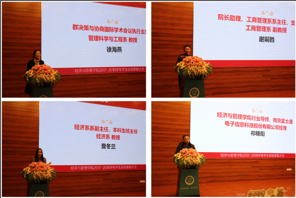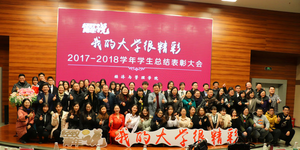 12月28日晚,“我的大学很精彩”经致青年说暨2017-2018学年九游体育 学生总结表彰大会在将军路校区主楼四楼报告厅隆重举行。学院院长周德群,学院党委书记焦宏图,校团委书记李君,副院长王英、邓晶,党委副书记涂志宏,南京富士通电子科技股份有限公司生产制造部部长祁穗阳,经管红石榴工作坊指导老师玛依拉,各系主任、副主任,团委书记,各年级辅导员以及四百余名经管学子参加此次大会。