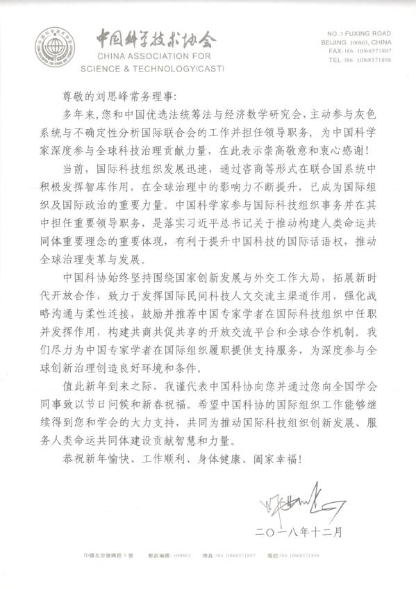 刘思峰教授收到怀进鹏主席来信后随即向九游体育 灰色系统研究所的师生以及中国优选法统筹法与经济数学研究所灰色系统专业委员会的全体会员、灰色系统与不确定性分析国际联合会的部分会员转达了怀进鹏主席的关怀和问候。刘老师认为:怀进鹏主席来信对我国乃至世界各国从事灰色系统与不确定性分析研究的学者无疑是巨大的鼓舞,必将对灰色系统理论的发展和传播起到不可估量的推动作用!希望通过长期持续的辛勤工作,把中国本土原创的灰色系统理论火种撒向全世界。