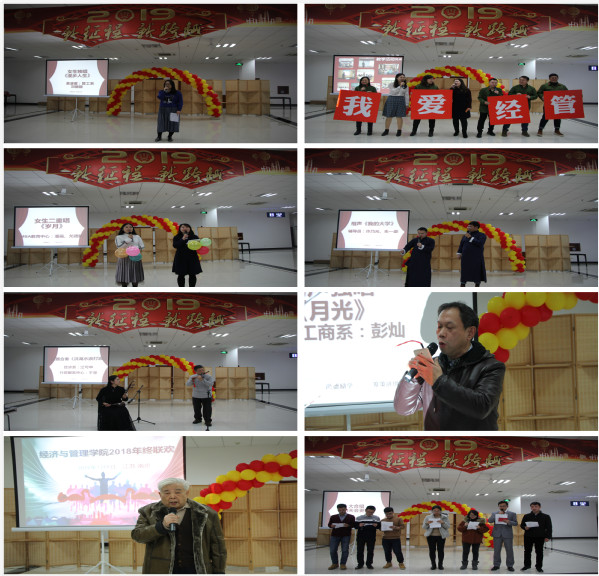 联欢晚会的节目更是异彩纷呈,高潮迭起。管工系刘丽丽老师的一首《漫步人生路》开启了迎新晚会的大幕;学生工作团队自编自导自演的《经典红歌串烧》充分表达了全院老师“我爱经管”共同的心声;“生活是个复杂的剧本,不改变我们生命的单纯”MBA教育中心带来的女声二重唱《岁月》流露出来的是对当下的珍惜和坚持;由我院辅导员许乃元、朱一豪搭档的校园相声《我的大学》,诙谐幽默,爆笑全场,将晚会欢乐祥和的气氛推向高潮;经济系江可申教授与行政服务中心于荣老师合作的笛子、二胡双重奏《洪湖水浪打浪》以及配乐诗朗诵《水调歌头》在古典音乐的魅力中,让人感受“但愿人长久,千里共婵娟”诗情乐意;退休教师李建康教授即兴演绎的奥斯卡经典电影英文歌《Edelweiss》,在大雪纷飞的寒夜中带给现场别样的温暖与感动;工商系彭灿教授的一曲《月光》唯美动人,洒满乡愁;“让我们的笑容充满着青春的骄傲,为明天献出虔诚的祈祷!”新入职的青年教师代表唱出了全体经管人的共同心愿《明天会更好》。