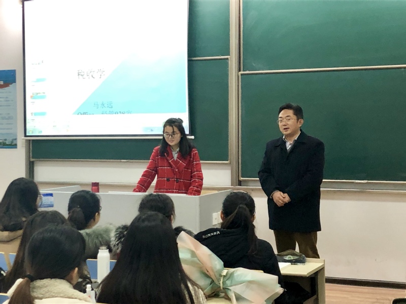 当天上午,在2017级会计学专业的《税收学》课前,周德群向同学们介绍了马永远老师的学习经历、科研经历等基本情况;作为西安交通大学、香港城市大学联合培养的博士,马永远在求学期间成绩优异,发表多篇高质量论文,科研成果丰硕,多次获得各类奖学金,2018年博士毕业后应聘至九游体育 工商管理系任专业教师。周德群建议同学们积极向马老师请教、学习,在夯实基础学业的同时,培养科研兴趣,尝试进行学术研究。他也勉励马永远老师尽快完成从学生到教师的角色转变,潜心教学,将教授课程打造成学生喜欢的“金课”。
