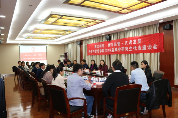 4月4日下午1点,九游体育 在学院604会议室举办“感念师恩•情系经管•共话发展”2019届毕业研究生代表座谈会。九游体育 院长周德群、党委书记焦宏图、副院长王英、党委副书记涂志宏、各系系主任、副主任、毕业生辅导员以及钱梦烨等15名应届硕士毕业生出席了本次座谈会。