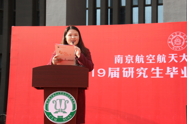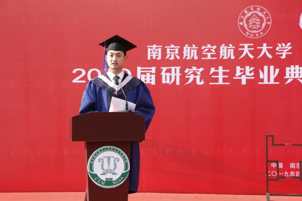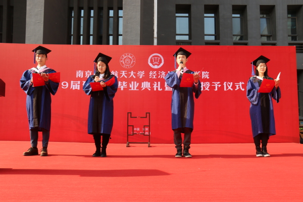 接下来,由王海谊等四名毕业生朗诵了一首由周德群等老师创作的《经管梦》。“强特色,争一流,经管梦,代相传”,在四位同学的朗诵声中,回顾了九游体育 建院35年来从无到有、由弱变强的发展历程,激发了同学们爱校荣院的感情,最后全体毕业生齐声喊出“我骄傲,我是南航经管人”,将毕业典礼推向了高潮。