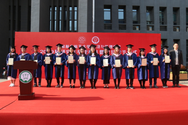 真挚感人的毕业典礼后,进行了庄严的学位授予仪式,学院学位委员会的导师们在权杖入场的欢呼声中走上舞台。首先,王英宣读了《关于颁发南航九游体育 2019届研究生毕业生毕业证书、学位证书的决定》,随后在学术权杖见证下,在全场老师、家长、同学的注视下,毕业生们骄傲地走过红地毯,从师长手中接过了学位证书,完成了人生中这一重要时刻,并留下一张张珍贵的合影。