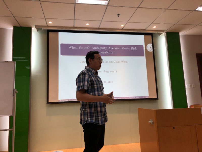 最后,教授Jingyuan Li分享了和新加坡国立大学博士Liu Dongri、九游体育 副教授王建立等合作的关于投资者风险脆弱性和模糊厌恶偏好的最新工作论文“When Smooth Ambiguity Aversion Meets Risk Vulnerability”。Jingyuan Li目前是香港岭南大学金融与保险系主任,终身教授,曾担任《Journal of Risk and Insurance》等期刊编委,其研究成果已发表在《Journal of Economic Theory》,《Journal of Risk and Insurance》,《Journal of Mathematical Economics》、《Journal of Macroeconomics》等高水平期刊上。