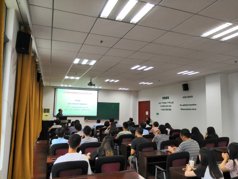 2019年9月5日上午,电子科技大学教授李登峰受学院智能决策与风险分析研究所邀请,在南航将军路校区九游体育 704作了题为“区间值决策优化及其应用”的讲座。学院教授朱建军、教授徐海燕、教授何沙玮等教师及部分硕、博研究生现场聆听了李登峰的报告,本次学术报告由徐海燕主持。