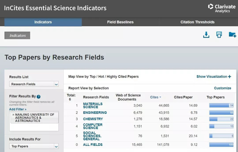 2019年9月11日,科睿唯安基本科学指标(Essential Science Indicators,简称ESI)数据库的更新数据显示,南京航空航天大学社会科学总论首次进入全球前1%,成为继工程学、材料科学、化学、计算机科学之后进入该行列的第5个学科,实现了前1%学科数量的新突破。