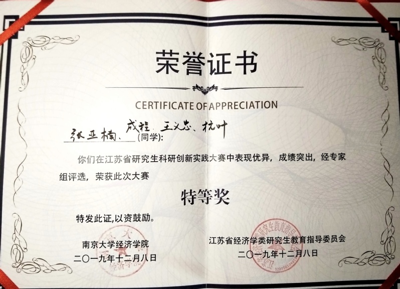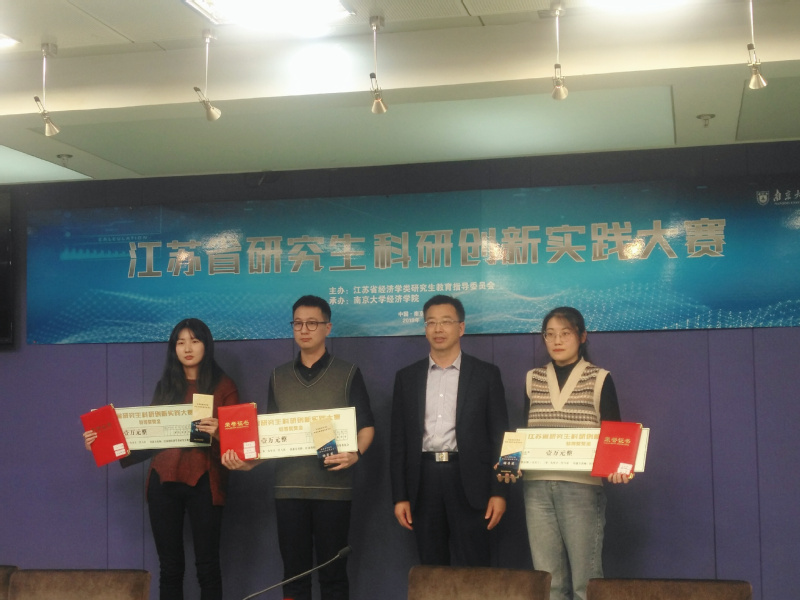 12月8日,江苏省研究生科研创新实践大赛决赛在南京大学顺利进行,共有来自19所全国高校的22支队伍参加汇报,九游体育 研究生张亚楠、成程、王义忠、杭叶组成的Wgroup(团队名)打败了诸多强手,荣膺特等奖,获得奖金10000元。
