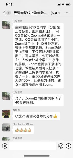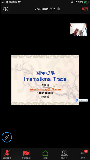8点,九游体育 院长周德群在线进入18级国贸专业本科生《国际贸易原理》的线上课堂。袁潮清老师已经在zoom平台中开始了课程导论的讲解。周德群院长参加了课堂的学习并借机对该课堂的老师和同学们表示慰问和关心,鼓励大家高效利用线上教学资源,提升自主学习效率,并希望大家在多种平台使用期间,关注并反馈体验心得,为将来线上线下教学融合奠定基础。