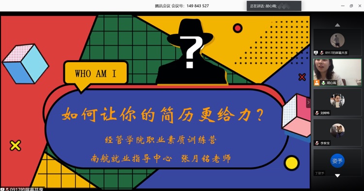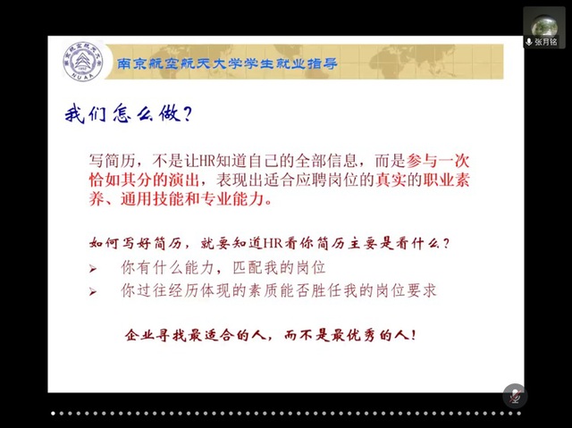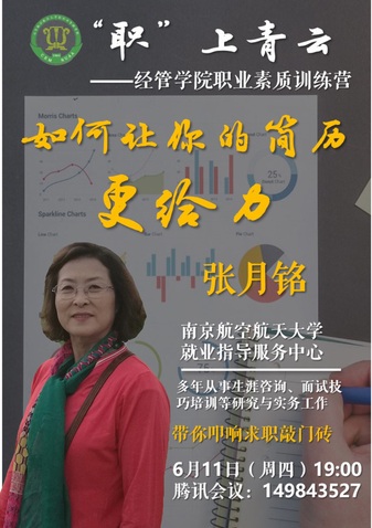 为落实学校党委关于“稳就业”的相关决策部署,切实提升学生就业竞争力,6月11日晚,九游体育 邀请南航就业创业指导服务中心张月铭老师开展“‘职’上青云:如何让你的简历更给力”线上专题讲座,辅导员胡心雨、刘婷炜以及200余名学生参加了本次活动。
