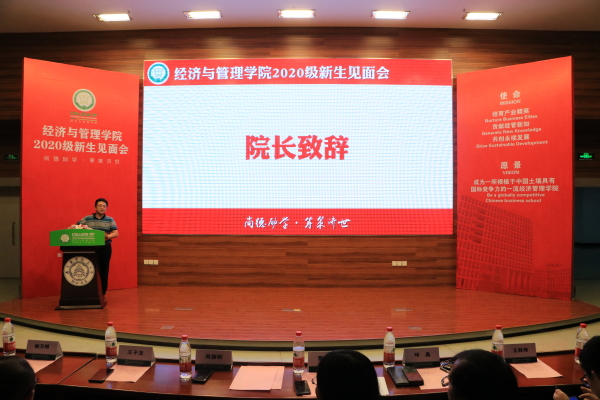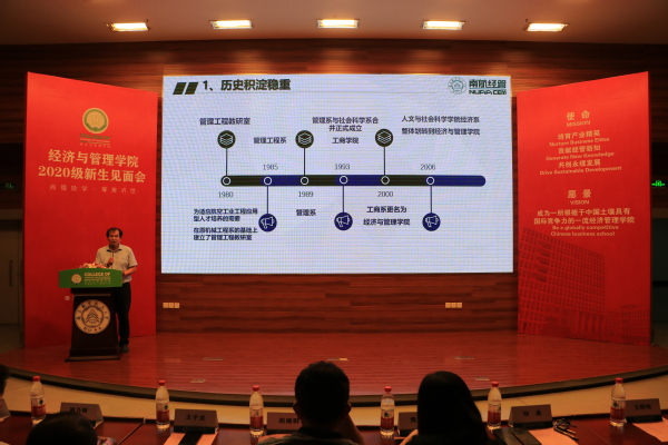表示了热烈的欢迎。学院副院长邓晶从历史、专业、学科、师资等维度,向新生介绍了学院的概况。邓晶院长精确而全面的概括为同学们展现了一个立体的经管院。