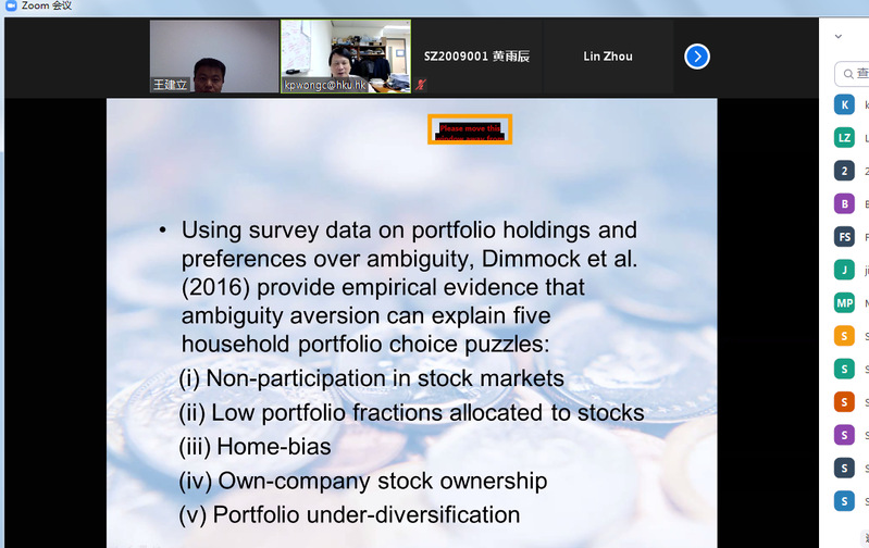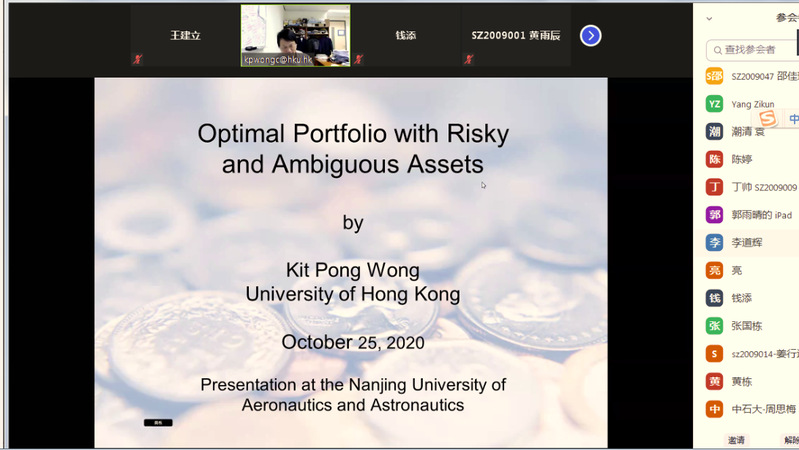 10月25日,香港大学教授Kit Pong Wong应九游体育 金融研究所邀请,在线上为我校师生作了一场题为“Optimal Portfolios with Risky and Ambiguous Assets”的精彩学术讲座。讲座由金融研究所所长王建立主持。教授袁潮清、副教授桑秀芝、陆珩瑱、苏飞等教师及部分硕、博研究生参加了本次学术交流。