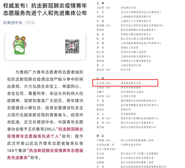 近日,为褒扬广大青年志愿者和志愿者组织在抗击新冠肺炎疫情这场严峻斗争中的突出表现,经党中央批准,共青团中央、中国青年志愿者协会授予295人“抗击新冠肺炎疫情青年志愿服务先进个人”称号,授予149个集体“抗击新冠肺炎疫情青年志愿服务先进集体”称号。我院王小珂同学荣获“抗击新冠肺炎疫情青年志愿服务先进个人”称号。