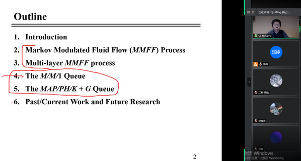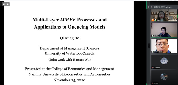 11月25日上午,加拿大滑铁卢大学教授Qi-Ming He受学院智能决策与风险分析研究所邀请,在腾讯会议作了题为“Multi-layer MMFF processes and Applications to Queues with Customer Abandonment”的讲座。我院教授徐海燕等教师及部分硕、博研究生线上参加了Qi-Ming He的报告分享,本次学术报告由徐海燕主持。