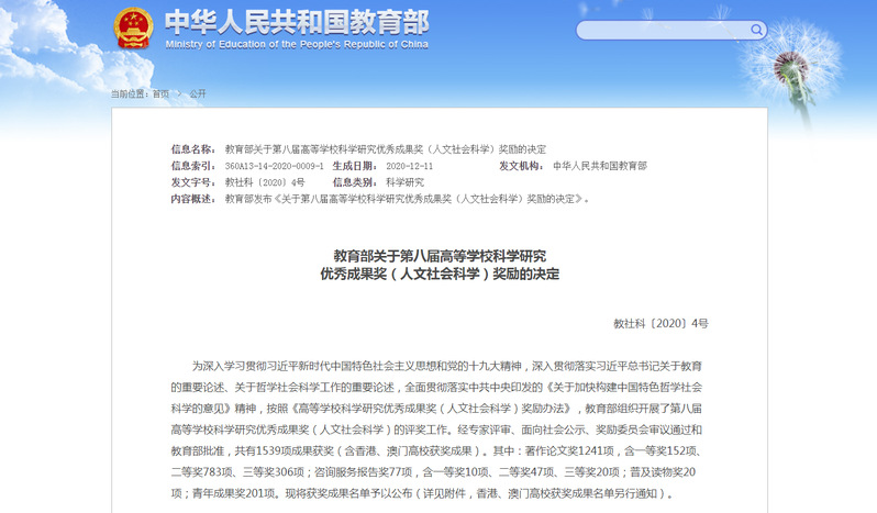 12月10日,教育部公布了第八届高等学校科学研究优秀成果奖(人文社会科学)评选结果。学院教师自主申报的2项成果获奖。此外,学院教师参与申报的多项成果也获得奖励。