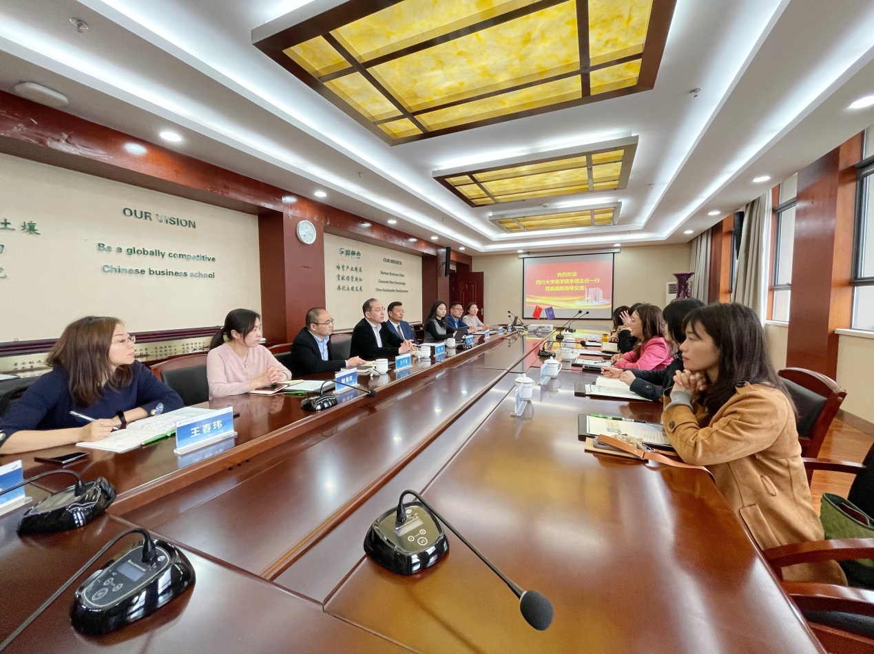 4月16日下午,四川大学商学院MBA教育中心主任李珊、招生品牌高级主管苟芳、品牌主管胡美怡、教务主管张倩、学生事务主管马力澜一行来我院调研。院党委书记苏州、副院长王子龙、教育培训中心执行主任杜刚以及中心所有老师陪同调研并座谈。
