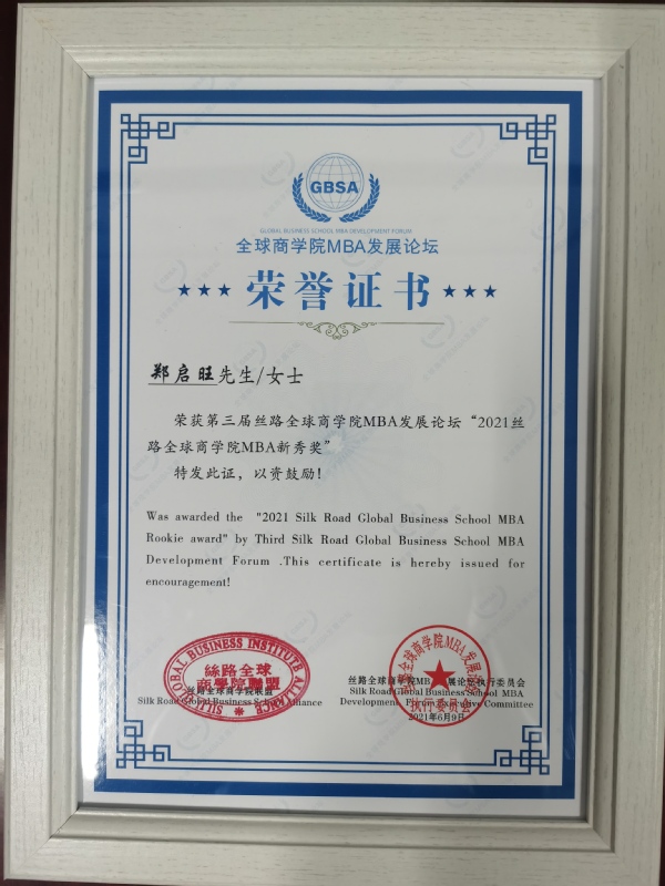 学员郑启旺获得“2021丝路全球商学院MBA新秀奖”丝路全球商学院MBA发展论坛,是在科学技术部、中国科学院、中国工程院、陕西省人民政府指导下,由科技部火炬中心、中共西安市委、西安市人民政府主办,西安市科学技术局、西咸新区秦汉管委会、陕西丝路经济管理咨询研究院联合承办。每年在西安举办,今年是第三届。