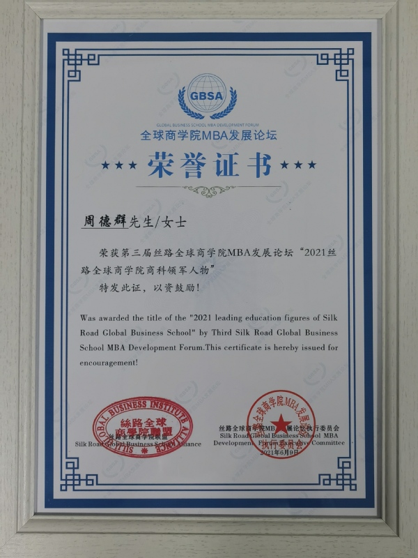 院长、长江学者特聘教授周德群获得“2021丝路全球商学院商科教育领军人物”