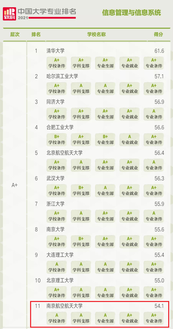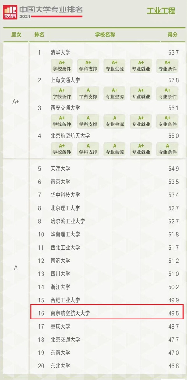 南航经管院管工系的两个本科招生专业在此次排名中成绩突出,信息管理与信息系统专业进入A+层次(前2%,全国参评高校共计562所),工业工程专业进入A层次(2%-10%,全国工业工程专业参评高校共计202所)。