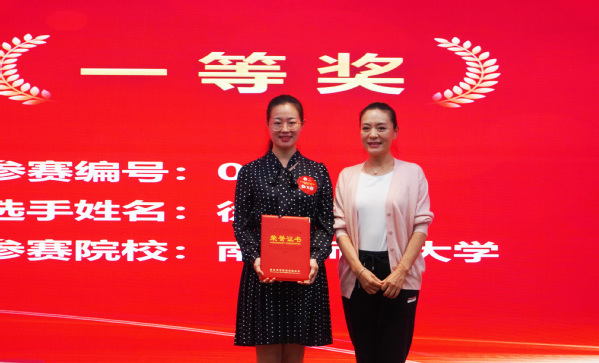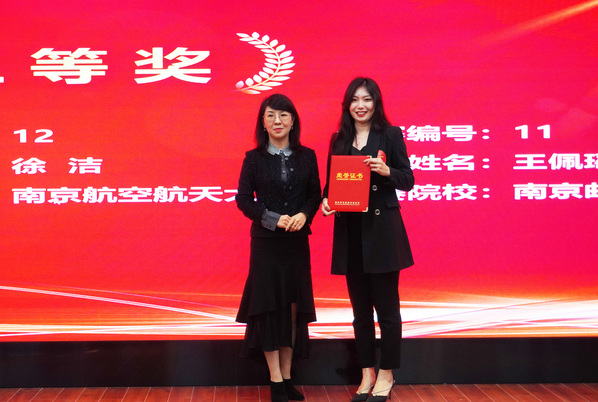 ▲江苏电视台主持人,金话筒奖获得者贺笑女士为南京师范大学徐玉萍颁发一等奖获奖证书