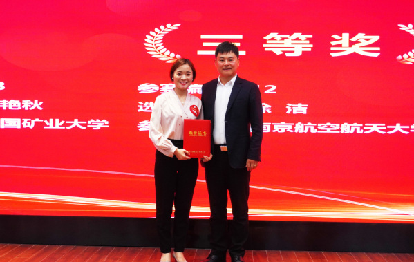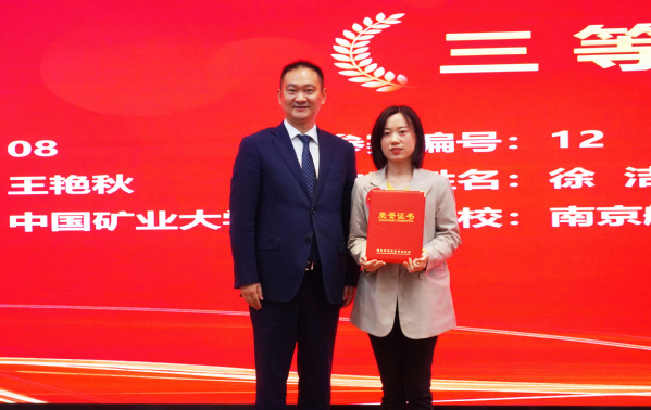 ▲江苏省MBA企业家联谊会副会长兼秘书长胡亚军先生先生为中国矿业大学王艳秋颁发三等奖获奖证书