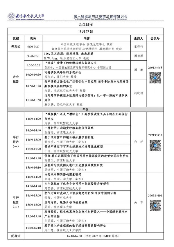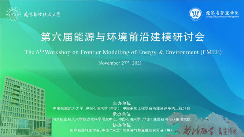 11月27日,第六届能源与环境前沿建模(The 6th Workshop on Frontier Modelling of Energy & Environment, FMEE)研讨会在我院成功举办。本次论坛由南京航空航天大学、中国石油大学(华东)和中国系统工程学会能源资源系统工程分会共同主办、南京航空航天大学能源软科学研究中心和中国石油大学(华东)能源经济与政策研究院承办,国际能源转型学会、中国优选法统筹法与经济数学研究会气候金融分会(筹)协办。会议得到《中国管理科学》、《环境经济研究》和《中国石油大学学报(社科版)》的支持。