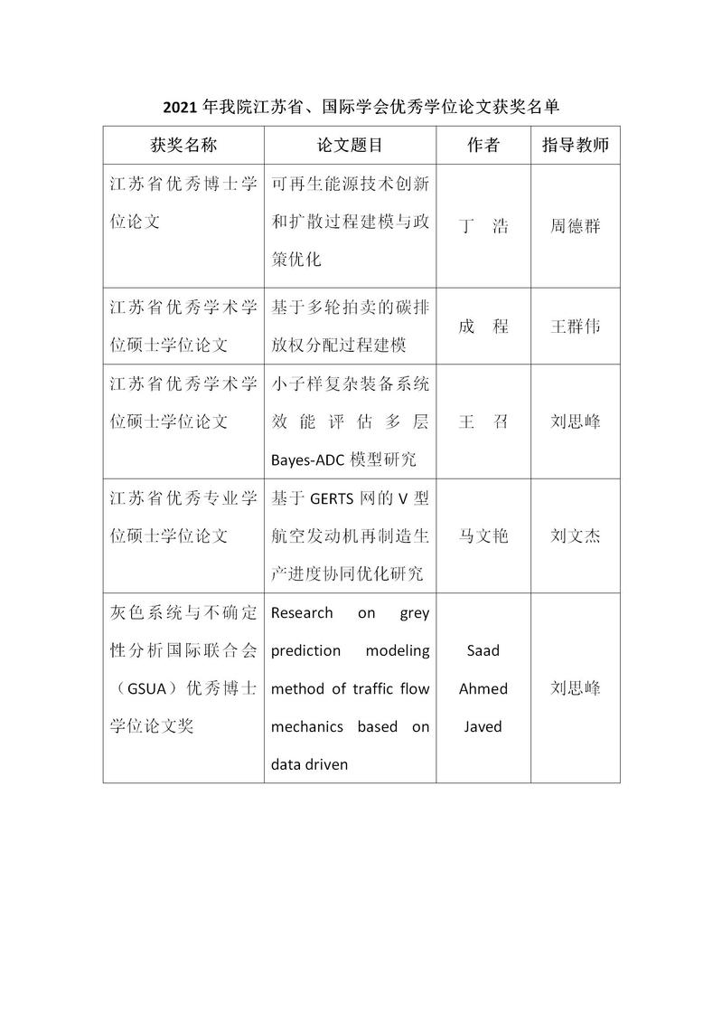 近日,2021年江苏省优秀博士硕士学位论文、国际学会优秀学位论文获奖名单陆续公布。我院师生表现突出,斩获2021年度江苏省优秀博士学位论文1篇、江苏省优秀学术学位硕士学位论文2篇、江苏省优秀专业学位硕士学位论文1篇、灰色系统与不确定性分析国际联合会优秀博士学位论文1篇。