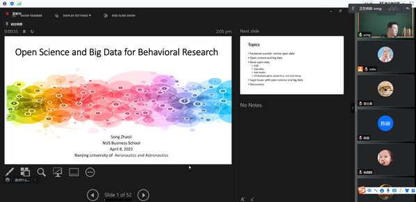 4月8日,新加坡国立大学商学院副教授宋照礼应九游体育 人力资源管理研究所和江苏省人力资源发展研究基地的邀请,在线上为我院师生作了题为“Open science and big data for behavioral research”的精彩学术报告。本次报告由教授胡恩华主持,相关教师、博士生和硕士生参加了此次学术报告活动。