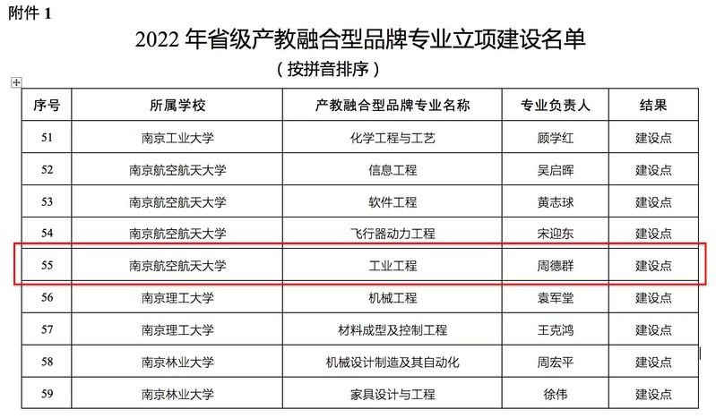 我校是江苏省机械工程学会工业工程分会的发起和挂靠单位,是我国最早设置工业工程专业的单位之一。南航工业工程专业是江苏省首批建设的品牌专业(2005年),江苏省工业工程领域首批唯一建设的重点专业类(2012年),工业和信息化部工业工程领域首批唯一建设的重点专业(2012 年),该专业2021 年位列 “软科中国大学排名”A 类层次(前2%-10%),多年被《挑大学选专业——高考志愿填报指南》评为全国最强专业前3甲。2019年,入选“双万计划”国家首批一流本科专业建设点,2022年,入选教育部首批虚拟教研室建设点,成为“江苏省工业工程专业虚拟教研室”的责任建设单位。