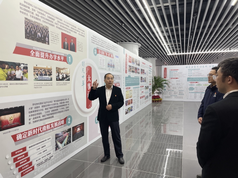 首先,苏州带领大家参观了南航“非凡十年”办学成就展。争创一流无止境,奋斗十年不寻常。苏州从建校历程、党建工作、人才培养、学术创新、开放办学、人才强校、美丽南航等七个方面,对学校近十年的建设历程与成果进行了生动讲解,以此鼓励师生深入学习贯彻党的二十大精神,为全面建设社会主义现代化国家、为加快建设“三航”特色鲜明的世界一流大学,建设中国特色、世界一流商学院再立新功。